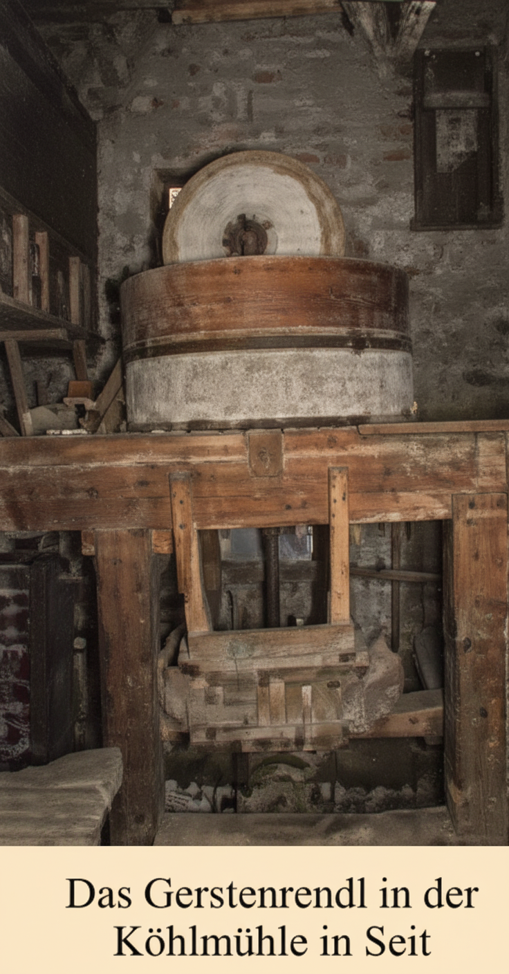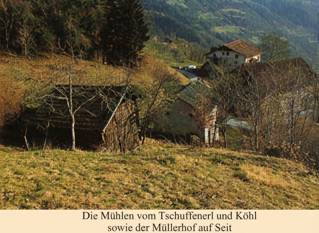 Von hier aus kann das Wasser entweder durchs Marchtal abfließen oder den steilen Wiesen Hang nach Süden queren, wobei es anfangs durch Holz rinnen und dann in einem Wasserwaal mit eingebauten Schleusen zur Verteilung in die umliegenden Wiesen fließt.Oberhalb des Müllerhofes wird das Wasser ein erstes Mal über eine Holz rinne, Uesch genannt, auf ein Mühlrad geleitet, jenes der Tschuffenerlmühle. Am Tür Balken des von Sonne und Regen schwarzen Holz Hauses ist die Jahr Zahl 1887 ein geschnitzt. Die Mühle ist aber viel älter und wurde damals wohl erneuert oder neu aufgebaut. Bereits im Theresianischen Steuerkataster wird beim Tschuffenerlhof eine »Hausmühl mit einem Gang« genannt. Über die Schußuesch stürzte das Wasser auf das Mühlrad, durch welches sämtliche mechanischen Vorgänge in der Mühle betrieben wurden. War das Mahl gut in der Gosse fertig, so konnte mit einer klug ausgedachten Vorrichtung die Uesch verstellt werden, damit der Mühlstein nicht leer weiter lief. Diese Vorrichtung war oft der schwache Punkt der Mühle, so daß die Uesch mit Hand ausgehoben werden mußte. In kalter Jahreszeit war zu vermeiden, daß sich beim stehenden Wasserrad Eis bildete: Dazu konnte der Boden der Uesch in etwa einem halben Meter Länge geöffnet werden, damit das Wasser rechtzeitig abfließen konnte.Gleich unter dem Mühlrad der Tschuffenerlmühle wurde das Wasser wieder in eine Holz rinne geleitet und zur knapp darunter stehenden Köhlmühle geführt. Das Gebäude ist hier gemauert und in gutem Zustand, an der Tal seitigen Wand ist die Jahr Zahl 1868 mit den Anfangsbuchstaben des Erbauers, des damaligen Köhlbauern Josef Zelger, angebracht. In dieser Mühle ist außerdem eine hier seltene Gerstenrendl erhalten; nur im Brantental gab es beim Weizgruber (Weizer) eine Gerstenrendl. Diese wurde mit einem eigenen Wasserrad angetrieben und hatte anstelle des Lafers zwei kleinere aufgestellte Steine, die mit einer Achse miteinander verbunden waren und wie zwei Räder im Kreis auf dem Lieger hintereinander her rollten.Berg seitig ist außen am Mühlhaus die Kuchldazugebaut, eine gemauerte Feuerstelle, die mit einem ausgedienten Mühlstein zugedeckt ist und von innen zum Wärmen der Speisen bedient werden konnte. Beim Müllerhof stand die nächste Mühle in einem Holz Haus neben dem Stadel. Mit dem Neubau des Stadels Ende der zwanziger Jahre kam die Mühle, die noch in sehr gutem Zustand ist, in den neuen Stadel und wird nun mit einer Wasser Turbine angetrieben. Auch diese Mühle wurde im Theresianischen Kataster genannt als Mihl mit 1 Gang und Sag, so die Mihlund Metzgerechtigkeit beihat.Die Müller Mühle war also die einzige gewerbsmäßig betriebene Mühle in Seit, bei der jeder, der keine Haus Mühle hatte, sein Getreide mahlen lassen konnte, dafür konnte der Müller metzen, das heißt, einen Teil des Mehls ein behalten.