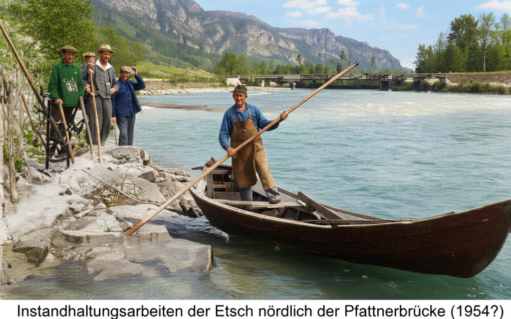 Dieser ergoß sich wiederum bis 1800, etwas unterhalb der Branzoller Länd in die Etsch und wurde damals bis nach Auer verlängert. Die erste Erwähnung des Landgrabens finden wir bereits im Landesfürstlichen Rechnungsbuch 1295-1301, wo es auf fol. 5 heißt: fossatum per pratum Leivers, also ein Graben durch die Wiesen in Leifers.Die genannten Zufluß Gräben hatten ihrerseits weitere kleinere Seiten Gräben. Diese wurden nach einem Plan im Zuge der Trockenlegung der Au, die,unter Kaiserin Maria Theresia um 1780 begann, nach und nach als schnurgerade Rinnsale geschnitten.Die bedeutendste Wasserbau Arbeit war die Begradigung des Landgrabens um den gewaltigen Kostenaufwand von 1534 Gulden. Aus den Rechnungen der Gemeinde für 1834 geht hervor, daß damals die Entwässerungsarbeiten durch Begradigung der alten und Schneiden neuer Gräben abgeschlossen war. Interessant ist der Beleg Nr. 8 der Rechnung, wo es heißt: Was die Kosten der Graben Eröffnung im Unterauermoos betrifft, so hat dieselben das Viertel St. Jakob inder Au zu bestreiten, und da sie bisher ihre Streu in Natura verteilt und nicht versteigert hatte, so sind keine Fonds vorhanden und müssen dieselben zur Deckung der nötigen Kosten entweder durch Anleihen oder durch Wüstungen (= eine Sondersteuer) herbei geschaffen werden.-Nur der ältere Weißhausgraben, der vielleicht bei der Gründung des gleichnamigen Hofes 1506 angelegt worden ist, schlängelt sich eher träge in weitem Bogen durch die Au. Dies tat übrigens auch der Stockgießen, welcher erst 1893 im Teil zwischen Leibele und Hirschen begradigt wurde. Diese Gräben wurden schon im Mittelalter teilweise von Stein Brücken überquert, denn so erklärt sich der Flur Name Bei der Steinprugg für das Feld bei der Landgrabenbrücke an der heutigen Bahnhofstraße.Die Instandhaltung und Räumung dieser Gräben oblag der Leeg Leifers und Unterau. Diese schloß sich südlich an die große Leege Grutzen an, welche bis unter St. Jakob reichte. Die erste Erwähnung dieser Leeg findet sich in einem Ratsprotokoll des Stadtrates vom Sonntag nach Ostern 1474, demzufolge verschiedene Personen aus der Au und Leifers durch den Rat aufgeboten werden, zu den Wasser bauten Stein fuhren zu führen.Die Leeg war ein freiwilliger Zusammenschluß der Bauern, welche ein direktes Interesse an der Verbauung der Etsch, an der Instandhaltung der Dämme und der Abzugs Gräben in der Au hatten. Die Leeg hatte einen Rat und einen Leegskommissar. Das Besondere der Leeg Leifers und Unterau war wohl ihr beachtlicher Urferhof auf dem Gemeinde Gebiet von Pfatten und rechts der Etsch. Der Ertrag des Hofes mußte für Graben- und Etschverbau verwendet werden. Der ca. 9 ha große Hof mußte von der Leeg 1800 an Franz Preindlsperger verkauft werden.
