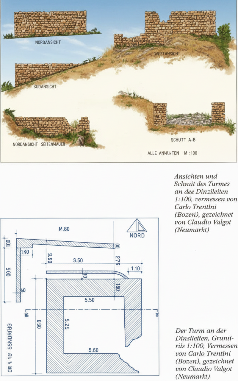 Vor allem die Enzbirg zeigt heute noch eine imposante Anlage mit der verfallenen Ring Mauer. Sie liegt auf dem höchsten Punkt des Breitenberges ober dem Hocheggerhof an der Gemeindegrenze zu Deutschnofen. ihre vorgeschobene und erhobene Lage ermöglicht einen weiten Rundblick. In Enzbirch verbirgt sich wohl unser Wort Burg; Enz durfte für -Ends stehen und soviel wie sehr groß bedeuten. Dieses Wort Enz finden wir dann auch im Regglberger Enzbau, also einem sehr hohen Baum.jedenfalls ist die manchmal verwendete Schreibweise Trensbirg falsch, die Urkunden verwenden nur Ennts Pirch." So wird noch 1686 im Vergleich zwischen dem Hochegger VeitGi-umer und dem Paui, am Stein, beim 'Vetter (Oberstein) und auf Prunn, nämlich Gregori Zipperle, wegen eines Streites um einen Holzschlag die Scbloßmauer von Einspirg, allwo voralters ein Scbloß getanden, als Grenzmarch vereinbart."Auch die Toponomastik der Flur Namen verrät uns im Gebiet ober Leifers langobardische Präsenz. Das große Viertel Mane zog sich vom Reggelberg über Rotwand, Kohlern, Virgl bis St. Jakob hinunter. Dort hat sich der Hof Name Mane in der Au erhalten (später Gasthaus Würstl). Dieses Mane wird von der langobardischen Ailmania abgeleitet, in welchem sich das germanische Her(i)man verbirgt. Eine Ailmania war also ein Siedlungsgebiet, welches vorn König oder vom Herzog freien Kriegern zugewiesen wurde." Die Gegenleistung der Arimannen bestand in der Heerfahrtspflicht und in der Verteidigung der Reichsgrenzen. Der Name Mane begegnet uns dann auch in Girlan", so daß Tessmann vermutet, daß sich unterhalb Bozen eine Art befestigter Limes von Kohlern quer über das Etschtal bis Firmian und Eppan zog.Im Viertl Mane liegt unweit des genannten Hofes Mane in der Au der sogenannteTurm inder Tinzlleiten (auch Dinzl), dessen Geheimnis bis heute leider nicht gelüftet werden konnte. Er würde freilich gut in ein Grenzbefestigungssystem passen. Allerdings dürfte der Turm auch in Zusammenhang mit der ehemals hart darunter vorbeiführenden Straße zu sehen sein. Außerdem führt gerade am Turm vorbei ein sehr alter Fußweg nach Seit. Der Verfasser hat den Turm mit Josef Nössing 1983 vermessen. Der Turm hat quadratischen Grundriß mit Außenmaßen von 8,5 m; er ist Tal seitig noch bis zu drei Meter Höhe erhalten und sitzt auf einem vorstehenden Porphyrfelskopf auf. Die Mauern sind bis zu 1,6 Meter stark. Der Eingang scheint sich in erhöhter Position befunden zu haben.