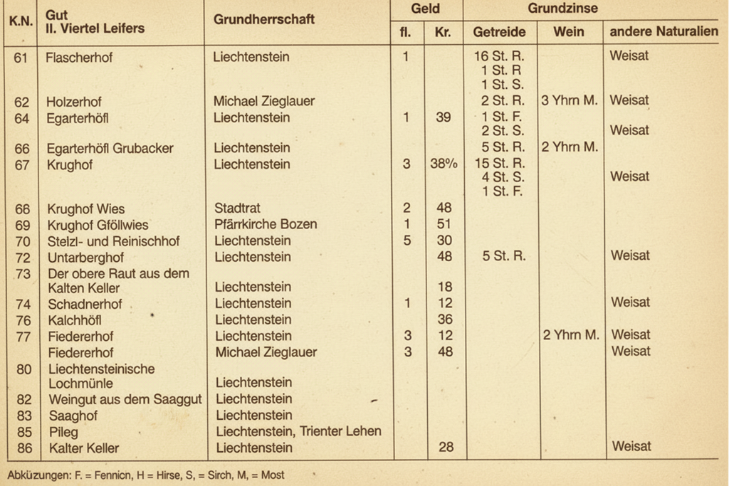 Während die Familien Geschichte« der Liechtensteiner im Beitrag von Gustav Pfeifer ausführlich behandelt wird, soll hier auf ihre Rolle als bedeutende Grund Herren unseres Gebietes eingegangen werden.Die Grafen von Liechtenstein saßen schon seit dem Ende des 13. Jahrhunderts auf Schloß Karneid; die Grundzinse von ihren Besitzungen in Leifers hatte ein Pfleger einzutreiben, von welchem das liechtensteinische Haus, auf welchem er saß, den Namen Pfleg erhielt. Der Großteil des liechtensteinischen Urbariums, übrigens Lehen des Bischofs von Trient, war schon seit dem 14. Jahrhundert zu Erbpacht ausgetan worden, jedoch sind die Pfleg selbst mit dem dazugehörigen Grund, der Unterberghof und Weißhaus davon ausgenommen. Auf diesen Höfen saßen Bestand Leute als Bau Leute oder Pächter auf Zeit. Der Verwalter der Erträgnisse der liechtensteinischen Grund Herrschaft hieß damals Amtmann und saß im liechtensteinischen Amts Haus am Muster Platz in Bozen.Im bereits erwähnten Grieser Gerichts Urbar von 1396 werden Grund holden der Liechtensteiner genannt.Einen wichtigen Hinweis über die liechtensteinische Grund Herrschaft gibt uns eine Urkunde von 1445, laut welcher Helena, Witwe Wilhelms von Liechtenstein, von dessen Kindern vierzig Mark ewiger Zinse aus bestimmten Gütern der Liechtensteiner in Leifers und anderen Orten erhält.