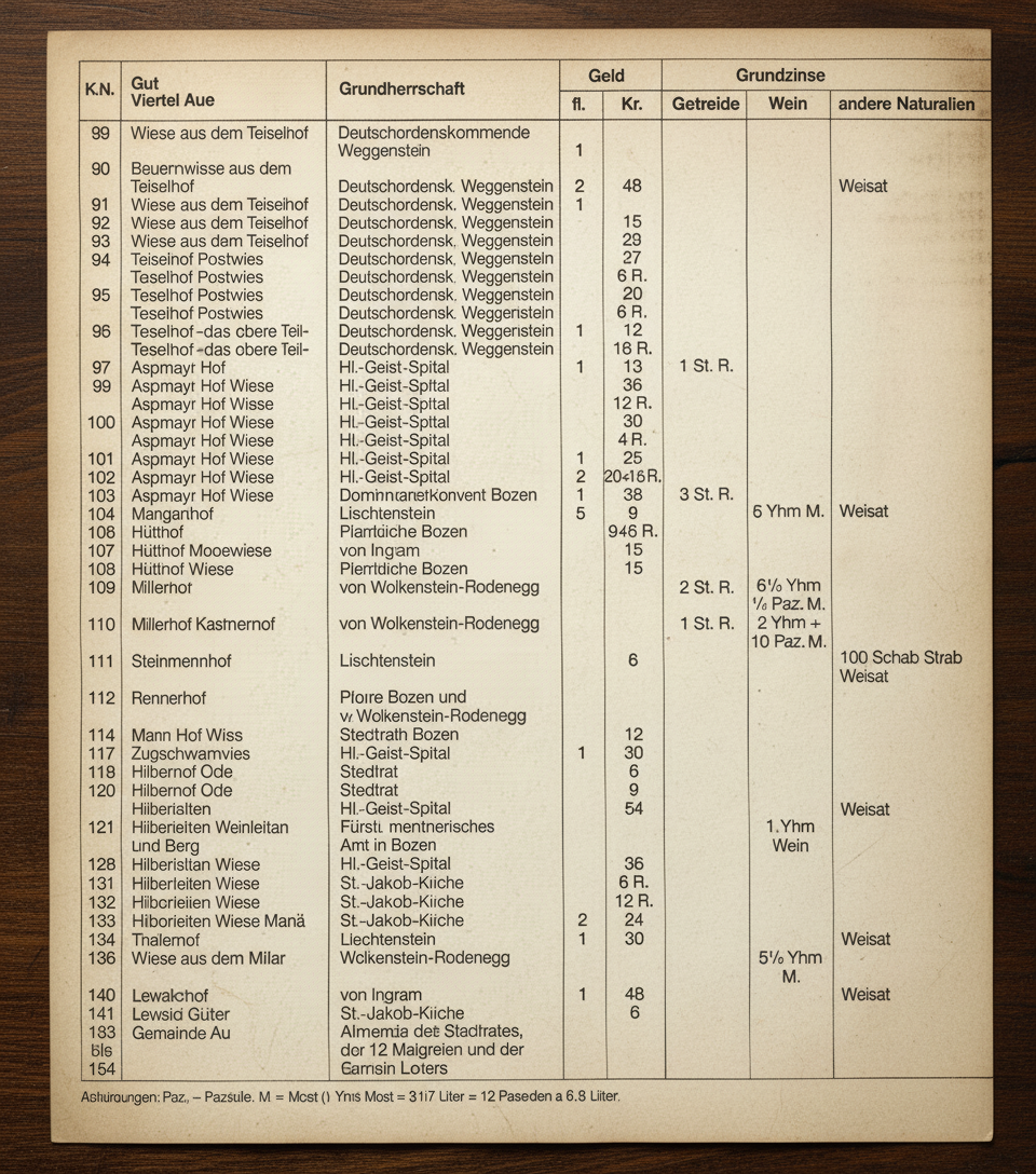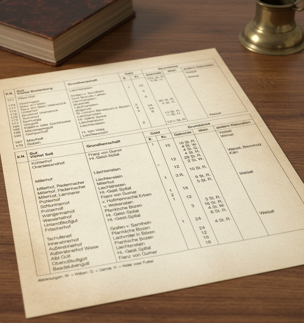 Diese beiden Familien finden wir in den Fußstapfen der Weinecker als bedeutende Grund Herren in Leifers. Die Urbar Bücher des Sigmund Gerstl", beginnend 1489 und von 1515 an bis 1534 durch seine Witwe Barbara, Tochter des Adam von Weineck, fortgeführt, beinhalten Grund herrliche Einnahmen aus Gries, Leifers, der Au unter Bozen, Branzoll, Pfatten, Kurtatsch, Kaltern.In diesen Büchern werden die Zinse nicht nur der Gerstl, sondern der mit ihnen verwandten Niederthor und der Weineck verrechnet.Mit 1496 beginnen auf fol. 27 mit Nr. 51 die Eintragungen über Breitenberg betreffend den Hochegger, wo:)die bisherigen Abgaben bestätigt werden. Den Zins bezieht der Gerstl. Auf dem Vetterhof sitzt Sigmund Märt als Infarender-(Mann) zu ainer Jacoben von Vettern Tochter.Er zinst vom Vetter- und vom Prunnhof. Sigmund Märt zinst vom Prunnhof 8 lb, bezieht aber vom Burger in Leifers 1 lb. So ist anzunehmen, daß beide Höfe von den Gerstlischen vergeben worden waren, daß aber der Burgerhof vom Märt in Afterpacht weitervergeben worden ist.Steffan aus Lüsen zinst vom Hof auf Puecha Buchner) 12 lb.Hawge (= Hugo) Niederthor bezieht den Zins von Ulrich Gob und Peter am Stein (fol. 281).Adam Weynecker bezieht den Zins vom Kölbl (fol. 29r), den 1496 Stefan Krueg als infarenderMann, d. h. Zugeheirateter, baut. Dieser zinst 24 Star Roggen, 1 Star Nüsse, 1 Fuhr Heu abwechselnd mit 1 Fuhr Eichenholz, 1 Fasnachthenne, zu Ostern 1 Kitz, 15 Eier, 1 Schulter, 2 Schnitthühner.Bezüglich der Dauer der Pacht Verträge fällt auf, daß die Erbpacht nicht mehr allgemein verbreitet war. 1502 hat Sigmund Gerstl den Hocheggerhof auf fünf Jahre hin gelassen, d. h. verpachtet (fol. 16 von Nr. 4).Im selben Buch begegnet uns auf fol. 17 wieder der Gampner-Hof: Leonbari Mayrzinstanstatt Symels Prueder unterm Steyn vom Gampnerhof 2 Star Roken, 1 Schulter oder 6 gr.Fol. 18 r: Leo Niderthorer bezieht von Lyenhart Müllner Dürr, Nyklaus Dürn Sun, vom Müllnerboff aufmarlin 8 lb und zu vasnacht 2 bennen.1503 sitzt Sigmund Tschuffier auf dem Kölbl (fol. 2or von Nr. 10).Daß die Bau Leute die schuldigen Grundzinse nicht immer pünktlich, ganz und ohne Widerrede gereicht haben, geht aus zahlreichen Eintragungen in diesen Zins Büchern hervor. Bezeichnend dafür ist eine Eintragung 1514 auf fol. 18 von Nr. 16:Item ich hab mit Hocheger abgerait (= abgerechnet) als Sachen vom 13. und 14. jar, wez ister mir aller ... schuldig worden 25 lb, 8 kr, verscechen (= geschehen) am Sambstag an SandWonnefentures Tag (St. Bonaventura am 14. Juli) im 15. jar und acht Huener sol erpringen vom 13.und 14. und der 15. get für sich selbs.Am Vetter- und Prunnhof folgt 1516 auf Sigmund Märt sein Sohn Mathes, auf Hochegger folgt 1522 der Sohn Wolfgang Hochegger.Auf dem Hof am Stain sitzt 1534 Stöffl, sojetz ein Paumann ist des Merten auf Praitenberg; demnach gehörte damals der Untersteiner zum Vetter.Als Grund Herrschaft wird 1583 auch die Kirche St. Peter auf dem Kofel genannt, welche eine Wiese gegen die Branzoller Länd hin hat (Vfb. B 1583, fol. 163). St. Peter war unter anderem Grund Herr über die Höfe auf Petersberg Moralt, Egg, Kammerland und Hilb.Es ist verständlich, daß die Bauern danach trachteten, Teil Bau in benannten Zins umzuwandeln, weil beim Teil Bau höhere Erträge durch fleißige und fachgerechte Bearbeitung des Hofes oder durch Meliorierung desselben nicht ausschließlich dem Baumann zugute kamen; dies zum Unterschied vom Pacht gegen benannten Zins. Deshalb wird der Teil Bau schrittweise zurückgedrängt. Der fixe Zins, ursprünglich in Naturalien und allmählich fast ausschließlich in Geld angeschlagen, wurde für den Baumann allmählich erträglicher und für den Grund Herrn als Einnahmequelle immer bedeutungsloser. Nicht uninteressant ist in diesem Zusammenhang die Tatsache, daß zu benanntem Zins aus getane Güter unserer Gegend in den Jahren nach den großen Bauern kriegen um 1525 teilweise und für bestimmte Zeit wieder zu Halbbau vergeben wurden. Dies betraf allerdings die sogenannte Bestands- oder befristeten Pacht Verträge, aber vereinzelt auch neue Erbleihe Verträge.Ein anderer Umstand, der den Bau Leuten bei benanntem Zins zugute kam, war jener, daß bei Rodungen neuer Kultur Flächen diese allgemein vom Grundzins befreit, das heißt bluteigen, waren.Wenn der Leihe Vertrag die Pflicht des Baumannes zur Besserung des Grundstückes bzw. zu Neu Rodung nicht ausdrücklich vorgesehen hat, so sind dadurch dem Baumann keine zusätzlichen erschwerten Lasten aufzuerlegen. Ein Beispiel für den letzteren Fall ist die Umwandlung von Au Wald in Acker, Wiese oder Weingut. Ein Beispiel für den ersteren ist hingegen die Umwandlung, auf Initiative des Baumanns, einer Wiese in Acker Land oder eines Ackers in ein Weingut. Hier kam es immer wieder zu Konflikten zwischen Grund Herrn und Pächter. Aus dem 16.und 17. Jahrhundert haben sich zahlreiche einschlägige Streit Akten erhalten.Neben dem Grundzins hatte der Baumann noch eine Reihe anderer Lasten zu tragen, vor allem die Steuern und den Zehent an die Kirche. Diese Abgaben lasten auf dem Gut und sind somit dingliche Rechte. Der Zehent ist keine Abgabe, welche in der Grund herrlichen Abhängigkeit wurzelt, und wird in einem eigenen Kapitel besprochen.Der aufgeklärte Staat erst brachte den Bau Leuten die Möglichkeit, sich von der Grund Herrschaft endgültig zu lösen. In der sogenannten Grund Entlastung 1849 haben eigene Kommissionen für jedes belastete Gut die vom Baumann zu leistende einmalige Ablösungssumme errechnet, welche sich aus der Kapitalisierung des Grundzinses ergab.