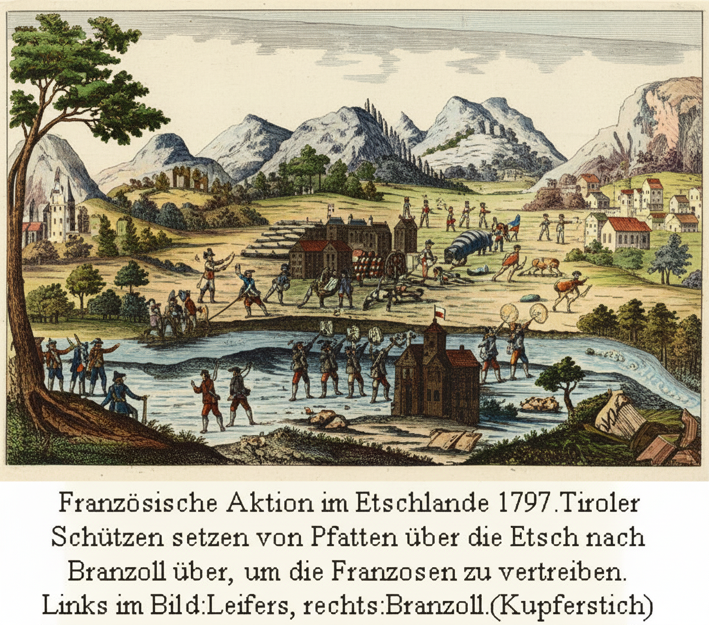 Diese Raitbücber sind eine äußerst wichtige Quelle für unsere Landesgeschichte, weil die Richter darin für jedes Amt (officium) die jährlichen Einnahmen an Geld und Naturalien anführen, die sie aus Steuern, Gerichtsgeldern, aber auch aus dem grundherrlichen Besitz des Landesfürsten verrechnet haben. Desgleichen sind auch die Ausgaben mannigfaltiger Art genau verrechnet. Die Eintragungen in den Raitbücherngeben auch Einblick in Lebensverhältnisse am Hof des Landesfürsten sowie der städtischen und ländlichen Bevölkerung. Darauf soll in einen anderen Kapitel noch näher eingegangen werden.Von 1331 andürfte das Landgericht wohl verpfändet worden sein, da die Reihe der Rechnungsbücher aufhört. Für diese Zeit ist bis zu seinem Sturze 1348 Engelmar von Villanders Richter in Gries. Ihm folgten weitere Pfandinhaber bis zum aufrührerischen Heinrich VI. von Rottenburg. Nach dessen Sturz hat der Landesfürst das Landgericht Gries und Bozen wieder durch Amtsrichter verwalten lassen, welche wieder Rechnung legen mußten. Der Amtsrichter bot für den Landesfürsten Gewähr, daß die Einkünfte aus Gericht und Urbar abgerechnet bzw. abgeführt wurden, was bei der Verpfändung des Gerichtes nicht der Fall war. Die, wenn auch nicht vollständige, Reihenfolge der Landrichter ist in der Landesbeschreibung von Stolz nachzulesen.Gebiets- und verwaltungsmäßige Umwälzungen brachten die Jahre der Tiroler Freiheitskämpfe gegen Frankreich und Bayern. 1801 kam das Gebiet südlich von Bozen zum französischen Besatzungsgebiet Italiens. 1803 kehrte das Unterland vorübergehend zu Österreich zurück, wobei es dem neugeschaffenen Kreis an der Etsch zugeteilt wurde. 1806 kam unser Gebiet zu Bayern; das Stadt- und Landgericht Bozen wurde verstaatlicht und mit den angrenzenden Gerichten vereinigt. Der Sieg der Franzosen 1809 brachte neue Gebietsaufteilungen. 1810 kam das Etschtal südlich von Lana und das Eisacktal südlich von Waidbruck zum französischen Königreich Italien. Die neue Verwaltungseinheit, zu der Leifers gehörte, hießDiparltimento Alto Adige. Leifers und Auer kamen zusammen zur Großgemeinde Branzoll. Diese wurde damals vom Sindaco Anziano Valduga geleitet. 1813 kam es zu einer neuen Einteilung des Diparti- mento Alto Adige: Leifers gehörte nun mit Unterau, Seit und Breitenberg (insgesamt mit 654 Einwohnern) zur Gemeinde Bozen und diese zum Kanton Bozen; dieser bildete einen Teil des Distriktes Bozen (STAB Kreis Amt Bozen, Bd. 150).
